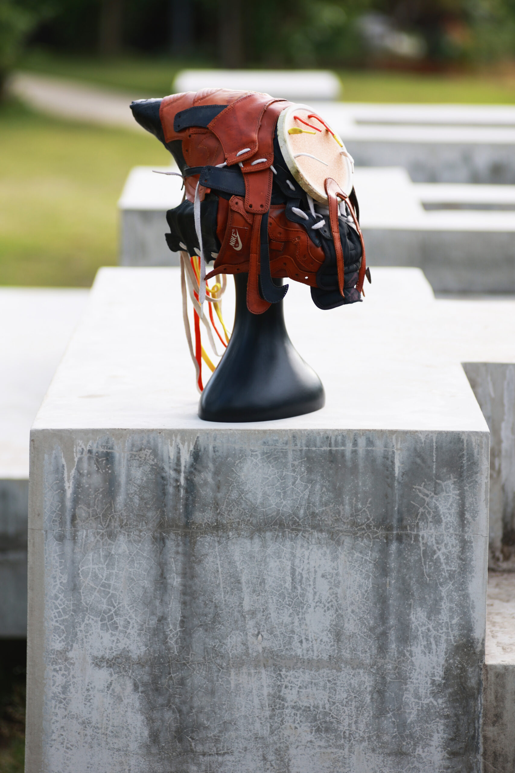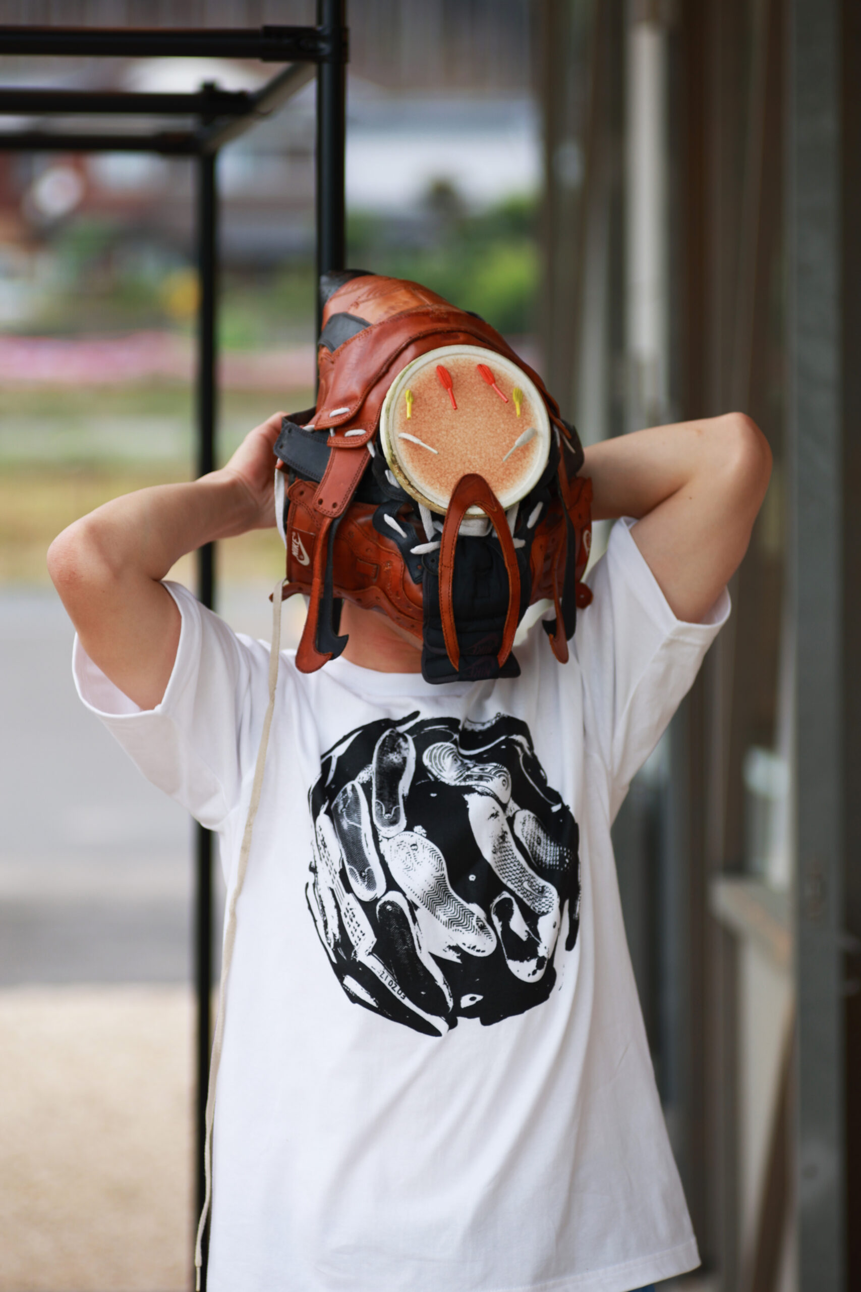 | Text | マスク作品は、「ボシ」と「スニーカー」で構成されており、それぞれの使用跡を結果としての傷ではなく、思い入れとしての痕跡の過程にYou2氏は美しさを見出しています。生物だけでなく無機物などの万物にも魂が存在する「アニミズム」という思想や、古くなったものに魂を見出す日本の妖怪観念とも通じる古典的な思想と現代的なマテリアルが融合しています。 |